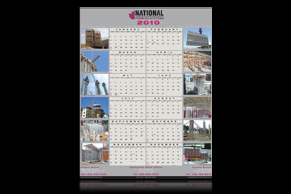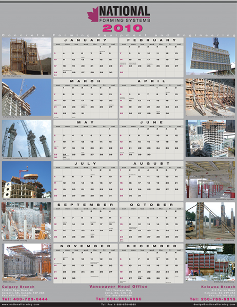 Calendars for a formwork company with its USA branch specializing in engineering, concrete forming equipment sales and rentals. The calendars were adjusted to the ambience and demands of employees in trailers on construction sites. Uncluttered, and with a smooth design, the calendars (34.5 x 26.5 inches in size) were laminated for protection from moisture.